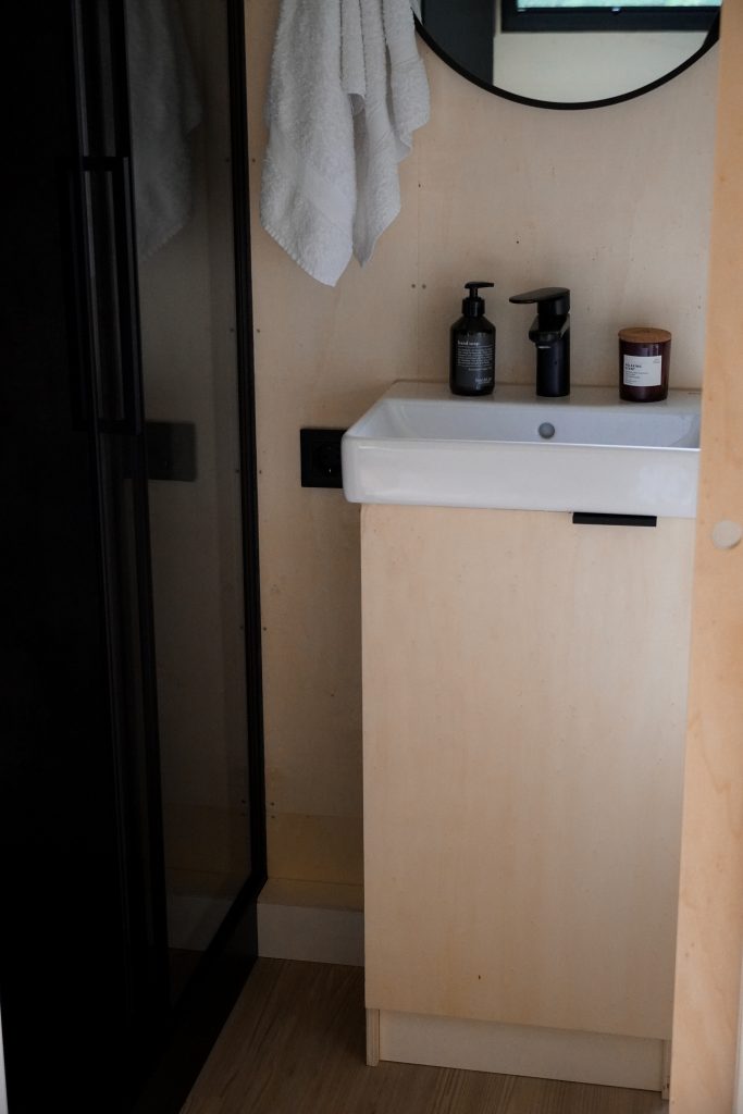 Das Badezimmer ist mit einer regulären Toilette, einer Dusche mit Frischwasseranschluss und einem Waschbecken ausgestattet. Toilettenpapier, Seife, Duschgel und Shampoo stehen bereit. Handtücher sind inklusive und können in der kalten Jahreszeit an der Wandheizung angenehm vorgewärmt werden.